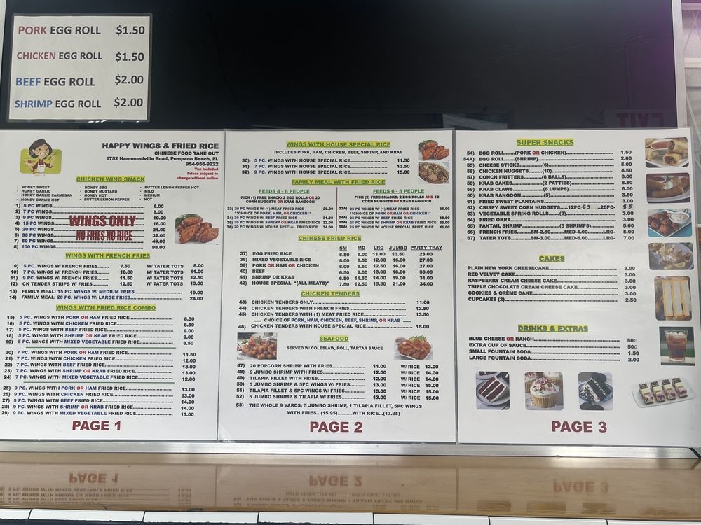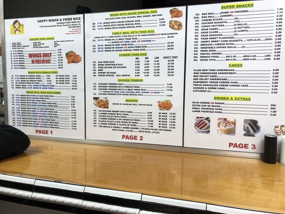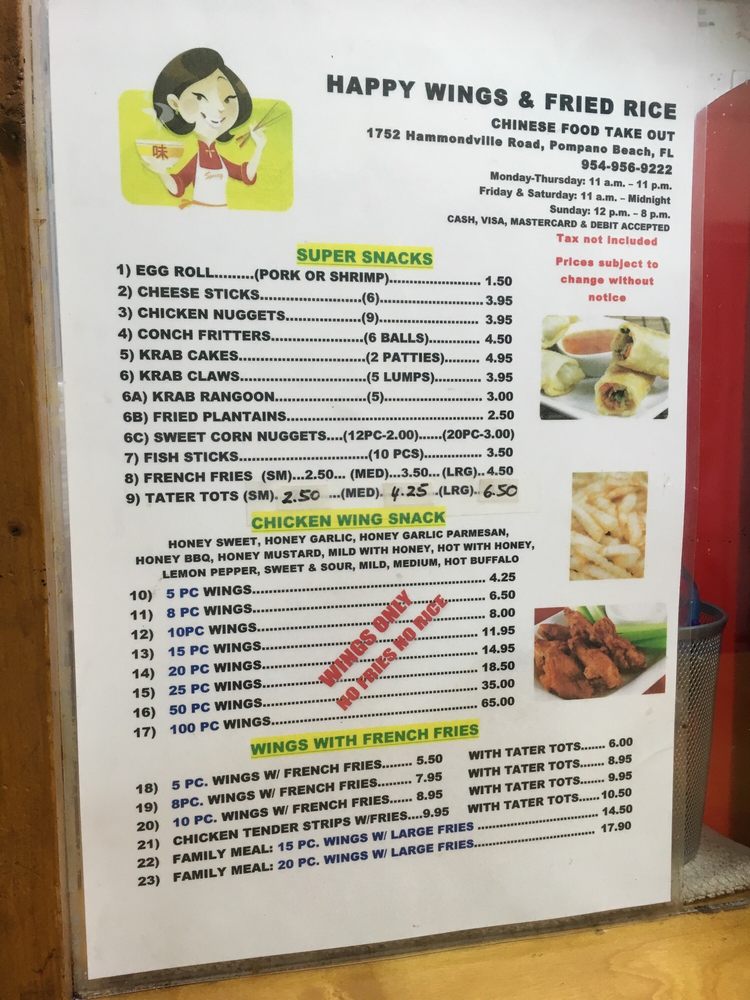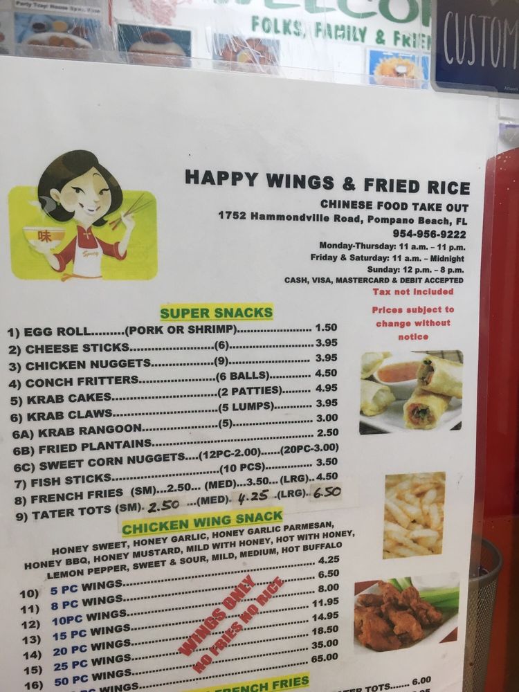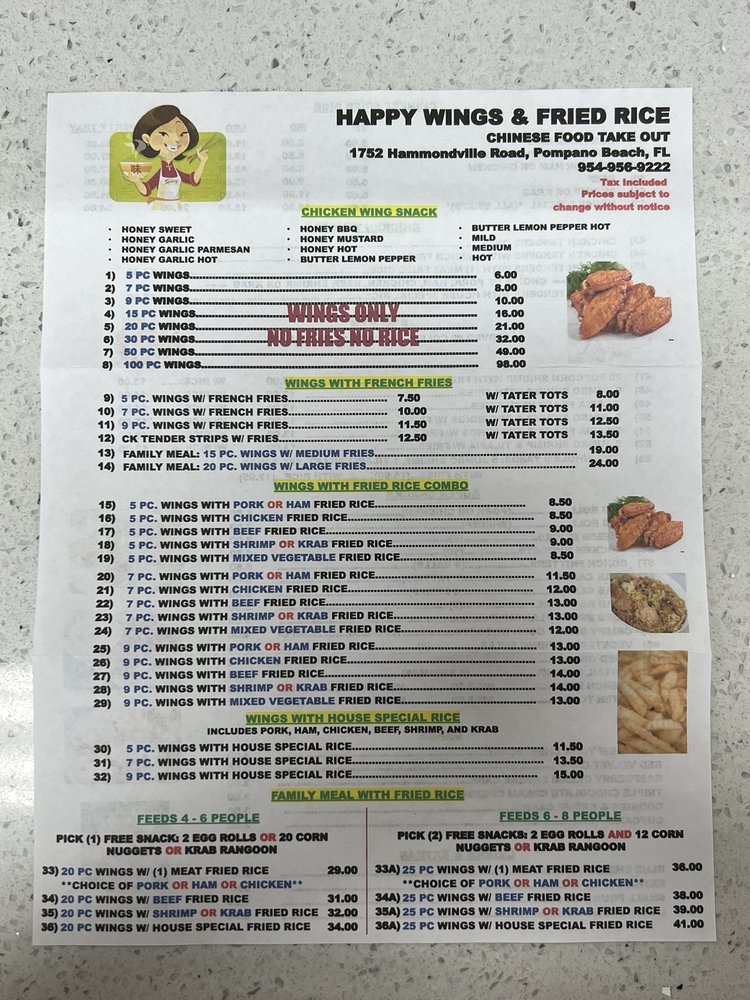 Introducing Happy Wings & Fried Rice, a hidden gem in Pompano Beach known for its mouth-watering wings and signature house special rice. Located at 1752 Hammondville Rd, this Asian-owned and women-owned establishment offers a plethora of options for both takeout and dining in, including vegetarian choices and catering services. Customers rave about the crispy wings with flavors like honey garlic and lemon pepper, as well as the generous portions of their signature rice dish. Despite its unassuming location, the friendly staff and delicious food make Happy Wings & Fried Rice a must-visit spot for Chinese cuisine enthusiasts. Don't miss out on this soul food Chinese restaurant's unique offerings and flavorful dishes that will keep you coming back for more.